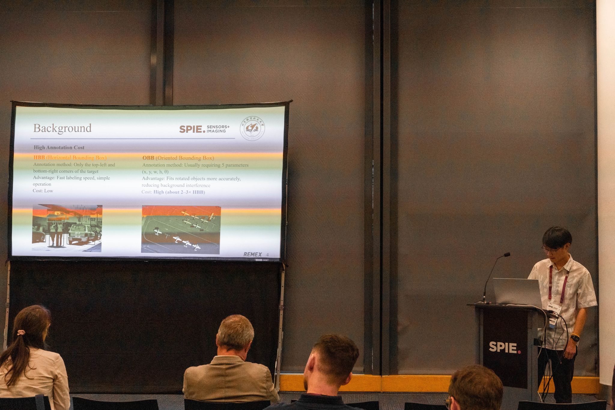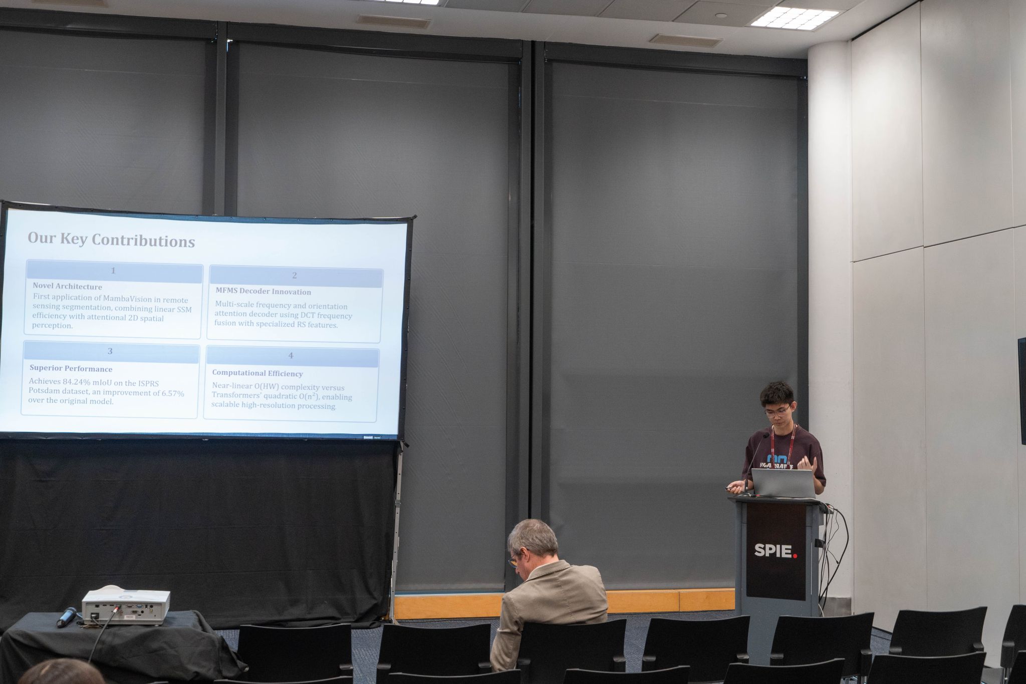 本次大会聚焦最新传感器和光子技术进展及环境遥感和安防领域的应用。大会分为学术研讨与技术展览两部分。学术研讨根据不同的研究领域分成多个会场,内容涵盖遥感、传感器技术、图像处理、通信技术、数据采集平台的研发以及在地球观测、天气监测、安防监控等方面的应用。团队成员参与了人工智能在遥感领域相关应用的论坛,介绍了团队在遥感语义分割、半监督目标检测、图像增强与融合等方面的研究成果。团队提出的基于选择性状态空间的语义分割模型,针对原始的Mamba架构进行了多种改进,有效的提升了图像处理的吞吐量和分割精度;提出的半监督目标检测架构,在原始数据集基础上使用伪标签进行数据扩充,有效提升了遥感目标检测的性能;团队的图像增强与融合方法,通过智能自适应的提取可见光和红外图像的互补特征,实现了基于红外图像的低光增强和像素级的图像融合,有效提高了极端条件的成像稳定性。