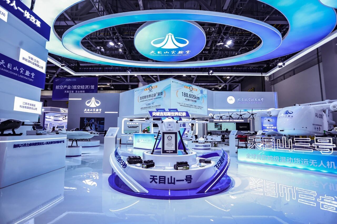 本届博览会集中展示 695 项新技术新产品,其中 57 件重磅展品聚焦产业前沿,天目山实验室全系列无人机组团首展即入选,成为航空产业(低空经济)馆最受瞩目的焦点。包括 “天目山一号”全球首款百公里级氢动力长航程多旋翼无人机及其2.0版AI智能氢动力长航时无人机、“天目山二号”全球首款垂起固定翼子母无人机、天目山三号系列-AL-100分布式短距起降货运无人机、“天目山四号”岛际物流水上无人机、“天目山五号”氢电混动长航程垂直起降固定翼无人机、天目山六号“小天”无人机自主作业智能体、“天目山八号”空基反无人机系统、“天目山十号”超声速静音旅客机以及天目山十一号-Vortex-F1智能超轻型单人低空飞行器等在内的多款创新机型。实验室与到场科学家、企业家、政府及用户代表齐聚一堂,共话开放合作,共绘低空经济发展新蓝图。