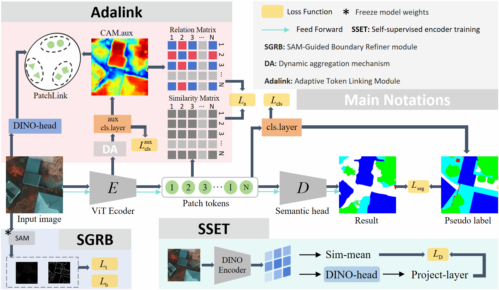 针对上述难题,团队提出ATSG模型(图2),创新设计两大核心模块:Adalink模块通过动态聚合机制自适应选择最优特征层,结合自监督编码器提升伪标签质量;SGBR模块借助SAM模型零样本分割能力,提取目标与边界先验,利用阈值控制其过度分割问题,提升小目标分割完整性。