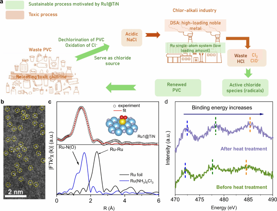 图1. 氯相关行业和环境问题的解决方案及氯化物电解催化剂Ru1@TiN的结构