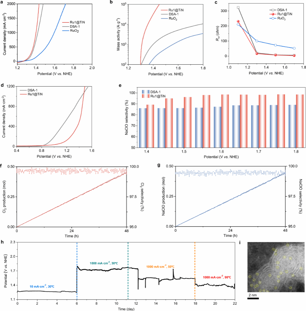 不同于常见的碳基载体,氮化钛(TiN)作为支撑材料,具备极强的抗腐蚀能力(耐受强酸/碱环境)、高导电性、强金属-载体相互作用。这使得Ru单原子在高电流密度和长期运行中仍保持高度分散,经过22天反复变工况测试后,未见聚集或失活。在模拟氯碱工业的严苛条件下(90°C,6 M NaCl + 0.2 M HCl),Ru1@TiN展现出极高的催化效率与稳定性:当电流密度攀升至1000 mA·cm-2(工业电解槽典型工况)时,其析氯过电位仅为77 mV,较商用DSA电极降低逾200 mV,且选择性始终保持在99.5%以上。更令人瞩目的是,该催化剂在22天连续变工况运行中(电流密度在200-1000 mA·cm-2间反复切换),活性衰减可忽略不计,表面无贵金属溶出或颗粒聚集现象。这一结果首次验证了单原子催化剂在工业级电流密度下的实用潜力,为替代传统高铱含量电极提供了坚实依据。
