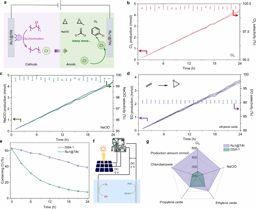 此外,研究团队创新性地将Ru1@TiN阴极用于聚氯乙烯(PVC)电化学脱氯,在0.5 M H2SO4电解液中实现近90%脱氯效率,同时阳极耦合CER反应生成高纯度Cl2(法拉第效率>98%)。该双电极体系成功将PVC废弃物转化为三类高附加值产物:氯气、次氯酸、环氧乙烷等产物,为定向转化废弃含氯塑料提供了精准控制方案。