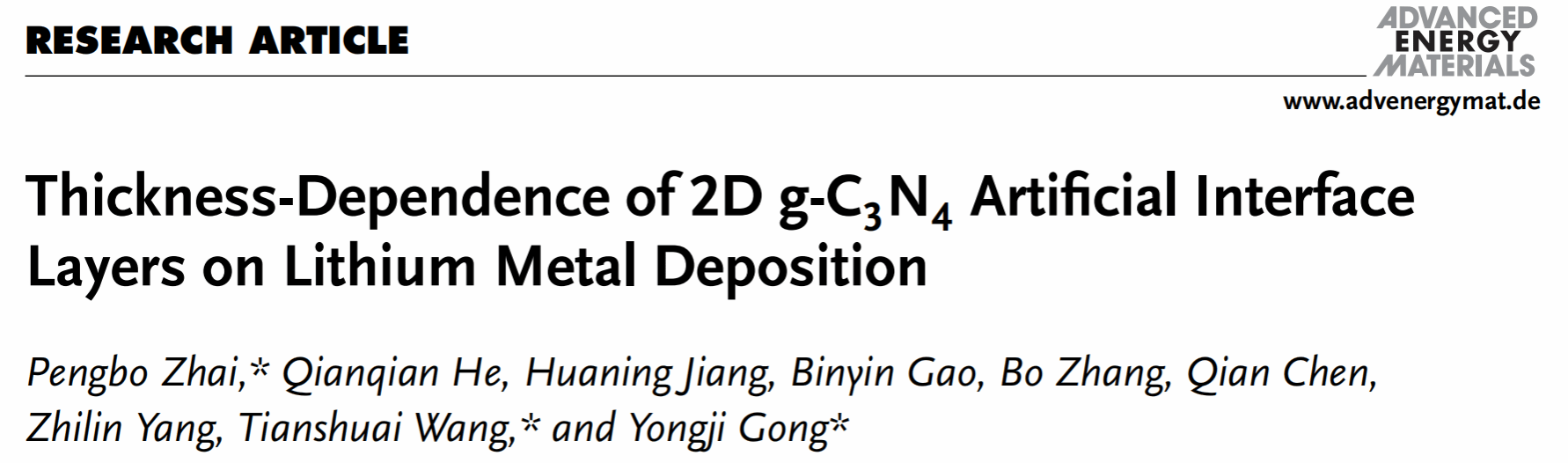 Wiley旗下顶级学术期刊《Advanced Energy Materials》(影响因子27.8)2023年12月刊登了天目山实验室为第一单位的最新研究成果“Thickness-Dependence of 2D g-C3N4 Artificial Interface Layers on Lithium Metal Deposition”。这一成果通过在铜箔表面构筑不同厚度的二维g-C3N4人工界面层,建立二维材料人工SEI的厚度与锂金属的沉积行为之间的相关性,为解决锂金属电池中锂枝晶生长问题、开发新一代储能器件提供有力的支撑。天目山实验室翟朋博特聘研究员为论文第一作者,天目山实验室/北京航空航天大学宫勇吉教授为通讯作者。