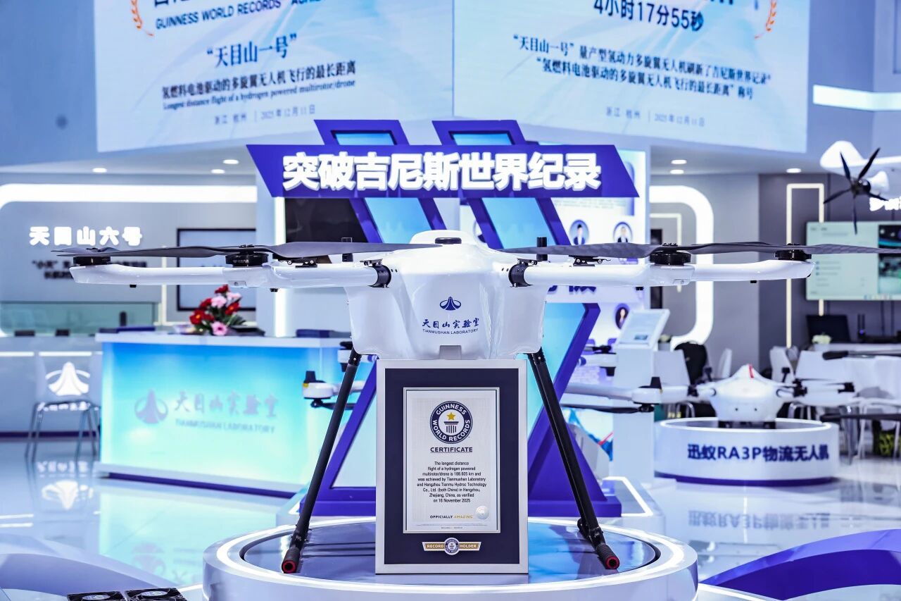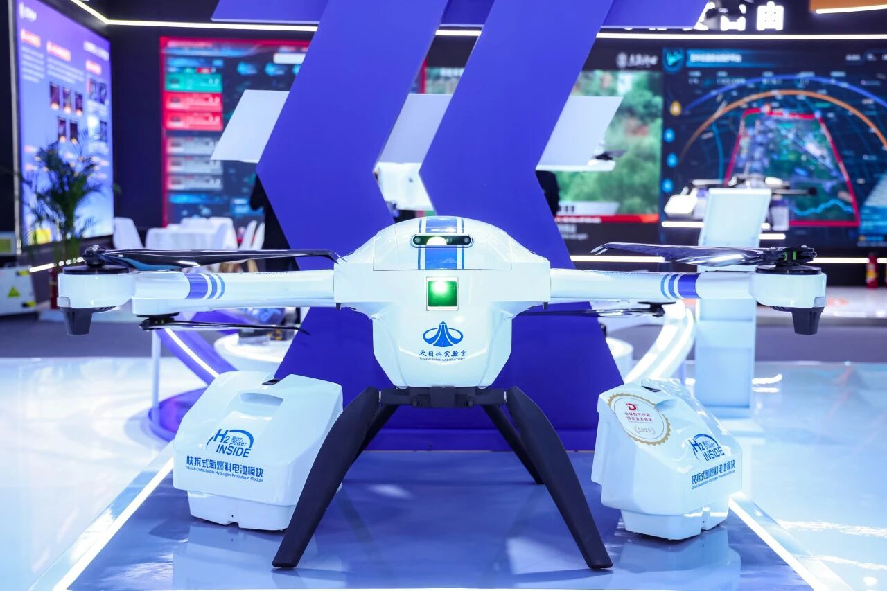 尤为引人注目的是,亮相本次博览会的 “天目山一号”氢动力无人机,已成功创造“氢燃料电池驱动的多旋翼无人机飞行的最长距离”吉尼斯世界纪录。它完成了不间断飞行188.605公里(用时4小时17分55秒) 的极限挑战,彰显了其卓越的可靠性与超长续航能力。目前,该机型已在高速巡检、油气管道巡查、新能源电站运维、海岛运输、城市交通管理及应急救援等多场景投入应用。