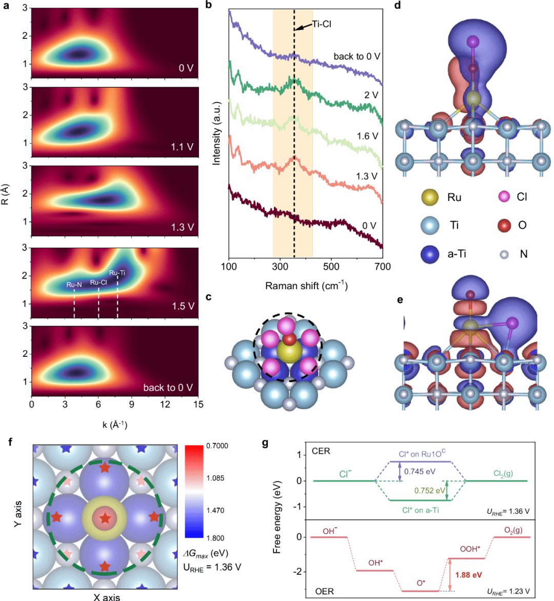 通过同步辐射XANES、原位拉曼光谱及DFT计算,研究团队捕捉到Ru₁@TiN在电化学工况下的动态活性位重构过程:反应中,单个钌原子(Ru₁)与载体TiN表面的钛原子耦合,形成“Ru1Oc-Ti4”多原子协同活性中心。与传统RuO2表面刚性活性位不同,这种动态活性点结构能通过Ti3+/Ti4+氧化还原缓冲效应稳定反应中间体,从而加强*Cl⁻吸附并降低Cl-Cl耦合能垒,其理论析氯过电位与实验值高度吻合。这一发现为理性设计抗腐蚀、高稳定性的单原子工业催化剂提供了全新理论框架。
